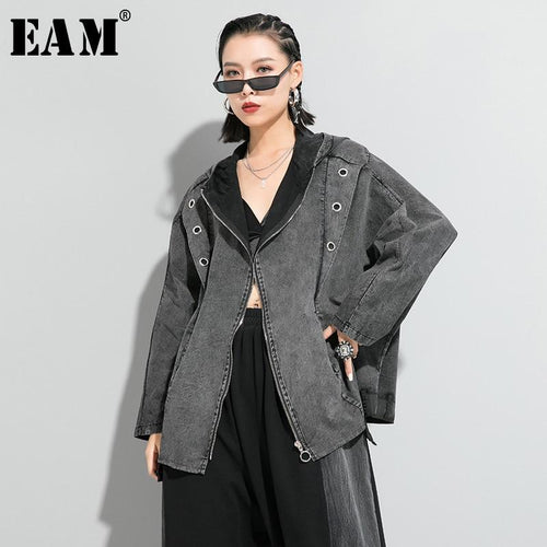 [EAM] Loose Fit Black Denim Split Joint Big Size Jacket New Hooded Long Sleeve Women Coat Fashion Tide Spring 2020 1R641