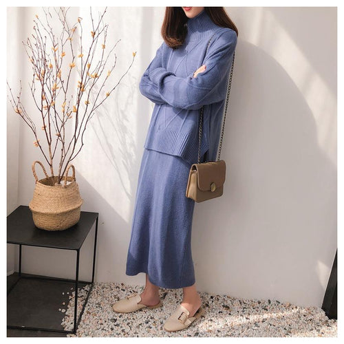 New Woman Winter Knitted Suits Casual Female Two-pieces Set Solid Turtleneck Loose Sweater + Vest Dress Suit for Lady Warm