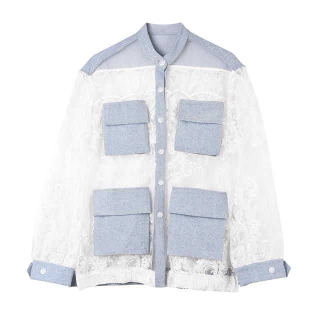 [EAM] Loose Fit White Lace Perspective Big Size Jacket New Stand Collar Long Sleeve Women Coat Fashion Tide Spring 2020 JU30105